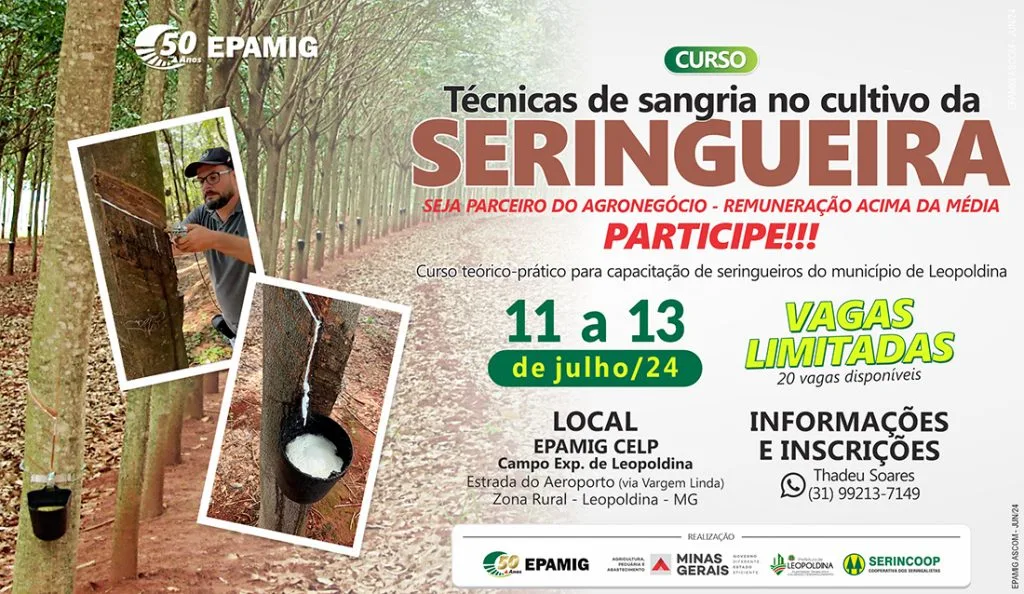 Capacitação, que acontece na próxima semana em Leopoldina (MG), oferece vagas limitadas (Leopoldina – 5/7/2024) A Empresa de Pesquisa Agropecuária de Minas Gerais (EPAMIG) realiza entre os dias 11 e 13 de julho, no Campo Experimental de Leopoldina, o curso “Técnicas de sangria no cultivo da seringueira”. O treinamento, que oferece 20 vagas, é voltado […]