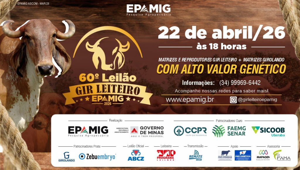 (Uberaba – 17/4/2026) No dia 22 de abril, quarta-feira, a Empresa de Pesquisa Agropecuária de Minas Gerais (EPAMIG) irá realizar a 60ª edição do Leilão Gir Leiteiro. O evento acontece às 20h, virtualmente, por meio da plataforma Remate Web, com ponto de encontro no restaurante Cupim Grill, no Parque Fernando Costa, em Uberaba (MG).