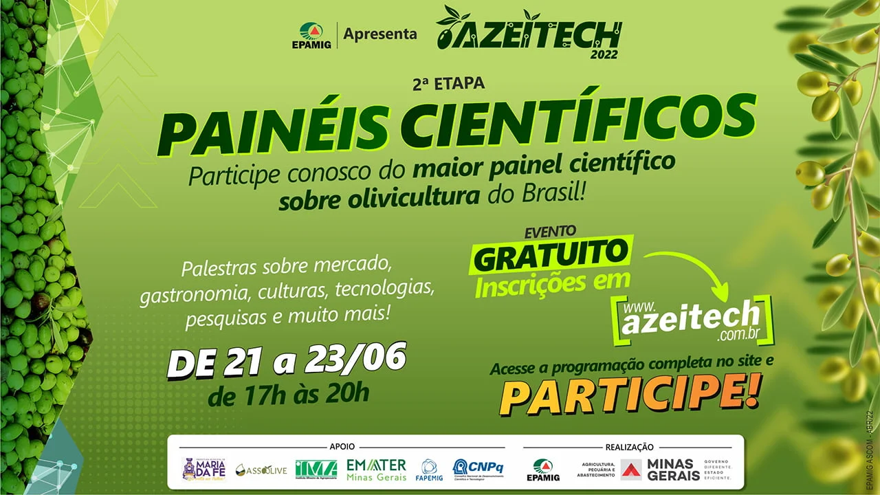 (Belo Horizonte – 20/6/2022) A Empresa de Pesquisa Agropecuária de Minas Gerais (EPAMIG) promove nesta semana, de terça-feira (21) a quinta-feira (23 de junho) a programação virtual do 2º Azeitech. Nesta fase, o evento, iniciado no dia 25 de março com o 17º Dia de Campo de Olivicultura e a 7ª Mostra Tecnológica em formato presencial, no Campo Experimental de Maria da Fé, contará com painéis científicos online. As inscrições são gratuitas e podem ser feitas pelo site