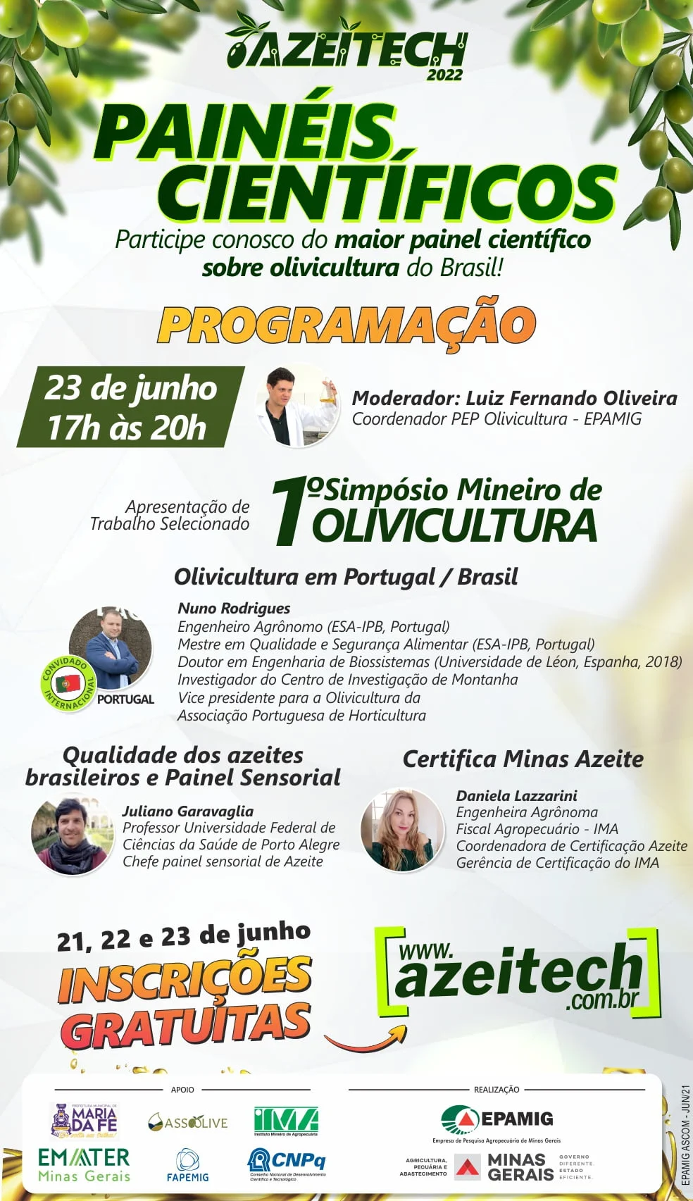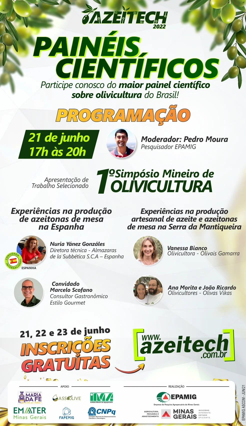O 1º Simpósio Mineiro de Olivicultura estreia na programação do Azeitech com apresentações, orais e ao vivo, de um trabalho no início das atividades de cada dia. Os assuntos selecionados são: “Épocas de ocorrência de cigarrinhas vetoras de Xylella fastidiosa em oliveiras na Serra da Mantiqueira”, na terça-feira (21); “Escarificação e estratificação de sementes de oliveira”, na quarta-feira (22); e “Azeite de oliva convencional e orgânico da Serra da Mantiqueira por uma abordagem multivariada”, na quinta-feira (23). Além dos painéis científicos e da possibilidade de interação via chat com palestrantes e convidados, os visitantes virtuais do Azeitech 2022 terão acesso a vídeos de dicas técnicas no espaço Oliva Play e à Mostra Tecnológica, com a presença das marcas patrocinadoras.