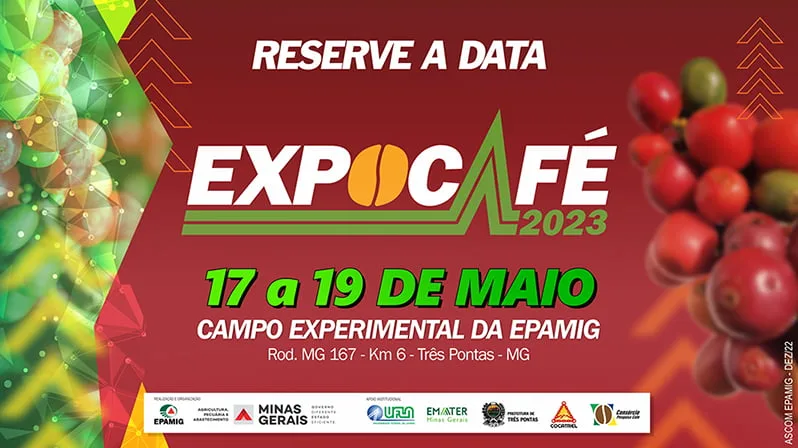 (Três Pontas – 14/12/2022) A Expocafé 2023 já tem data definida. A principal exposição de máquinas e tecnologias para a cafeicultura no Brasil será realizada entre 17 e 19 de maio, no Campo Experimental da Empresa de Pesquisa Agropecuária de Minas Gerais (EPAMIG) em Três Pontas, no Sul do Estado.