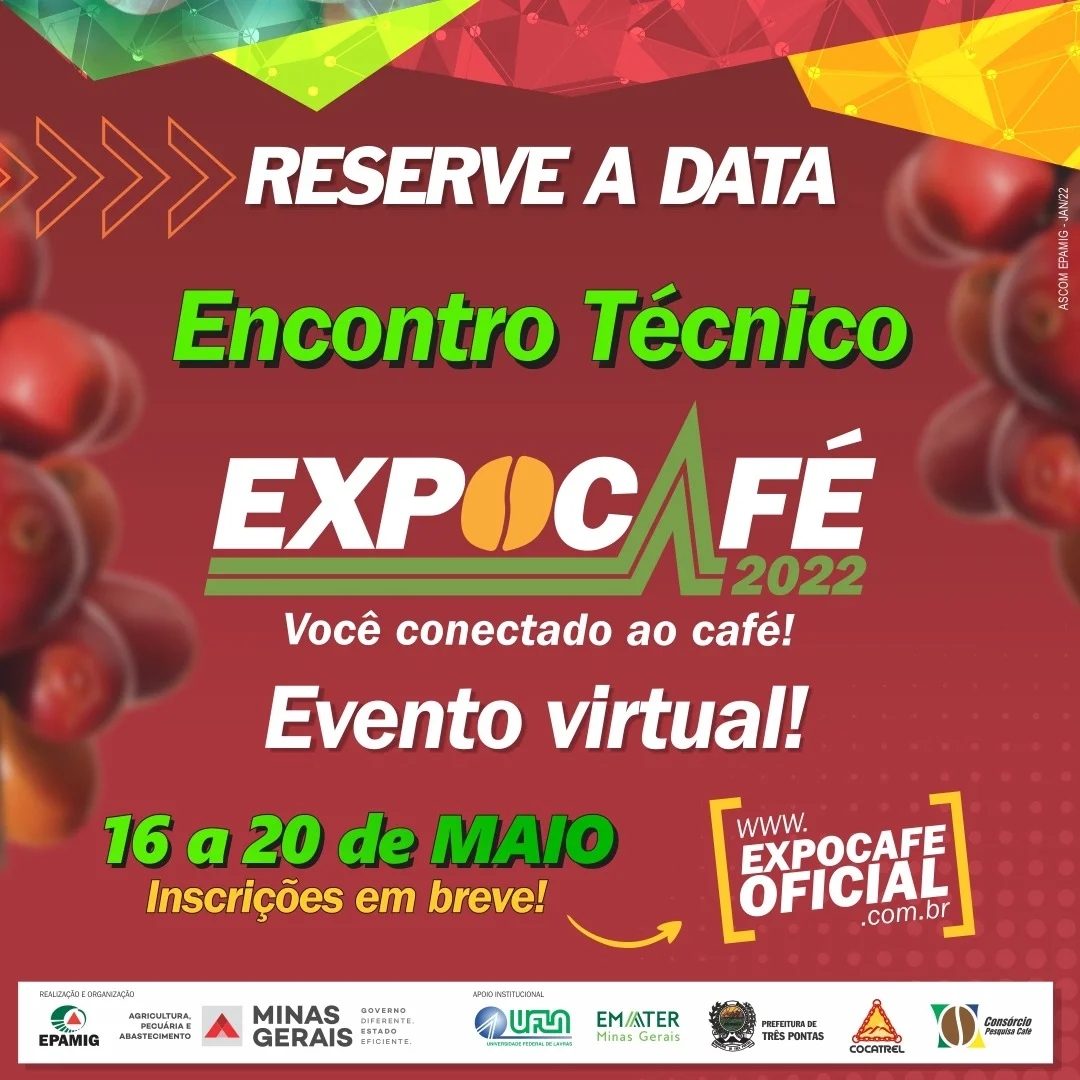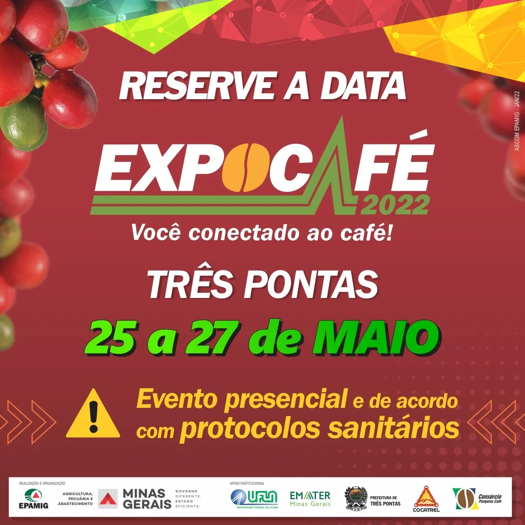 (Belo Horizonte – 11/1/2022) O Conselho gestor da Expocafé definiu as datas e o modelo do evento em 2022. Neste ano, a principal feira da cafeicultura nacional vai ocorrer entre os dias 25 e 27 de maio, no Campo da EPAMIG de Três Pontas , município do Sul de Minas Gerais. Para participar, o público e os expositores deverão respeitar os protocolos sanitários de prevenção à Covid-19.