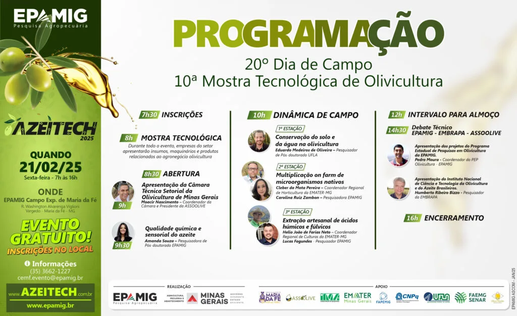 A EPAMIG irá realizar o Azeitech 2025, evento gratuito marcado para o dia 21 de fevereiro, no Campo Experimental de Maria da Fé. A programação tem como tema central “práticas agrícolas sustentáveis e agricultura regenerativa”.