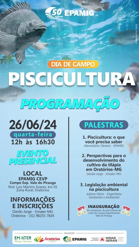 O dia de campo atende a uma demanda conjunta da Prefeitura Municipal e da Emater-MG de Oratórios e contará com palestras sobre a implantação, cultivo de tilápias e legislação ambiental. Na oportunidade também será inaugurado o Entreposto de Piscicultura de Corte do Campo Experimental Vale do Piranga, para a comercialização de alevinos de tilápia produzidos pelo Campo Experimental da EPAMIG em Leopoldina.