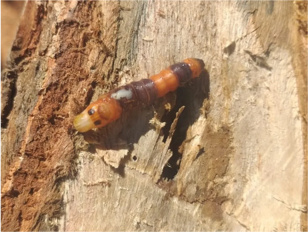 A praga, popularmente chamada de “broca do tronco do pequizeiro”, foi identificada como uma lagarta da família Cossidae, que escava galerias no tronco das árvores, comprometendo sua integridade e saúde.
