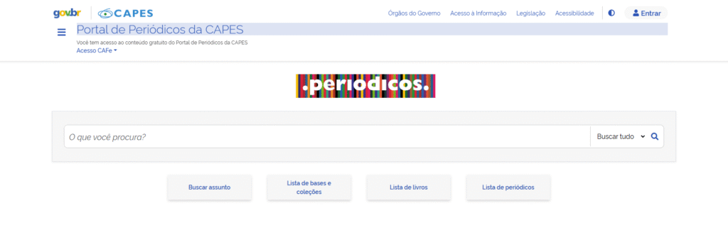 O Portal de Periódicos da CAPES funciona como uma biblioteca virtual e reúne um vasto acervo de conteúdo científico, incluindo periódicos, livros, teses, dissertações e outros recursos voltados ao suporte de instituições de ensino e pesquisa no Brasil.