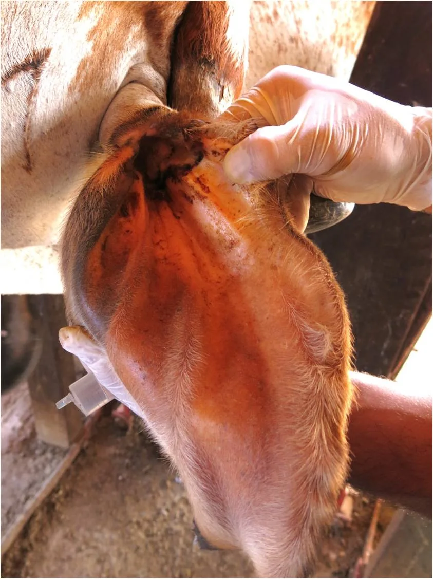 “A raça Gir apresenta orelhas longas e pendulosas, com um pavilhão auditivo comprido, o que cria um ambiente propício e favorece o desenvolvimento do parasito”, explica o pesquisador da EPAMIG, Daniel Sobreira Rodrigues. “É importante destacar que os principais sintomas são decorrentes de uma infecção bacteriana secundária, que acontece após a infestação da orelha do animal. O parasito se estabelece no conduto auditivo, se alimenta, e esse processo favorece a infecção, provocando o quadro clínico de otite”, completa.