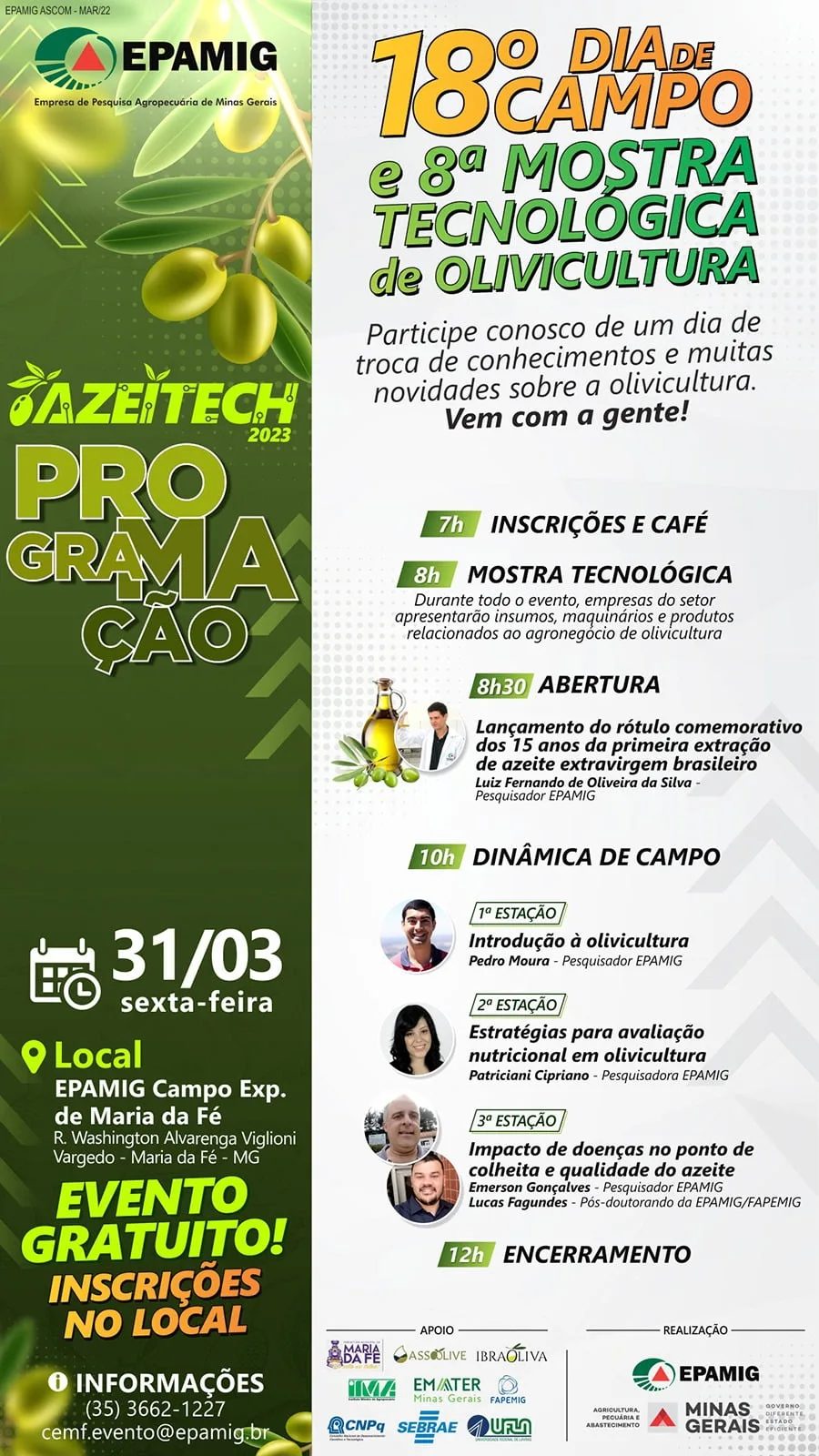 As atividades do Azeitech são gratuitas e não necessitam de inscrições prévias. Informações cemf.evento@epamig.br, (35) 3662-1227 – www.azeitech.com.br.