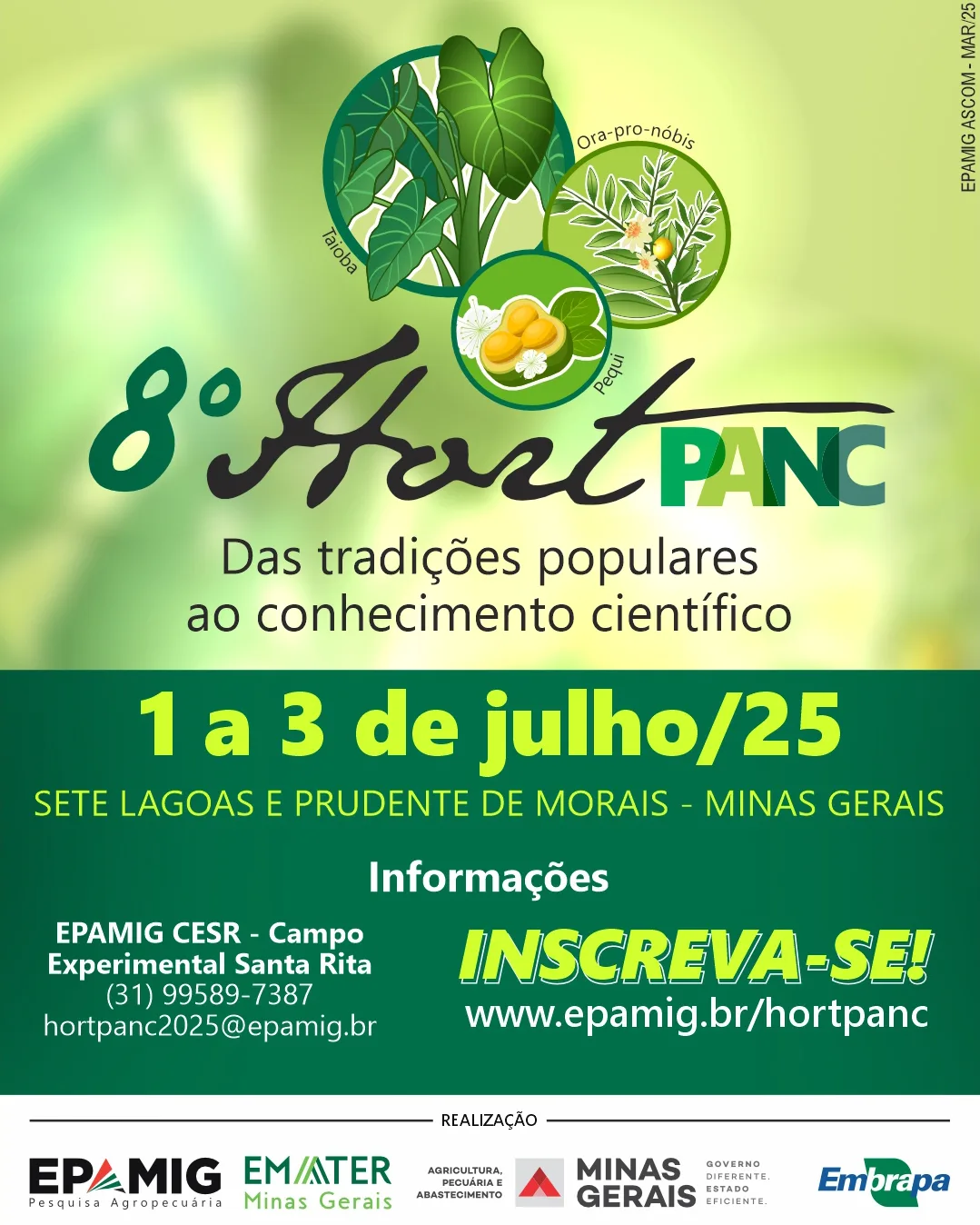 Entre os dias 1 e 3 de julho, as hortaliças PANC serão destacadas no 8º HortPANC. A edição será organizada pela EPAMIG em parceria com a Embrapa Hortaliças e a Emater-MG. O tema central será “Hortaliças PANC: das tradições populares ao conhecimento científico”.