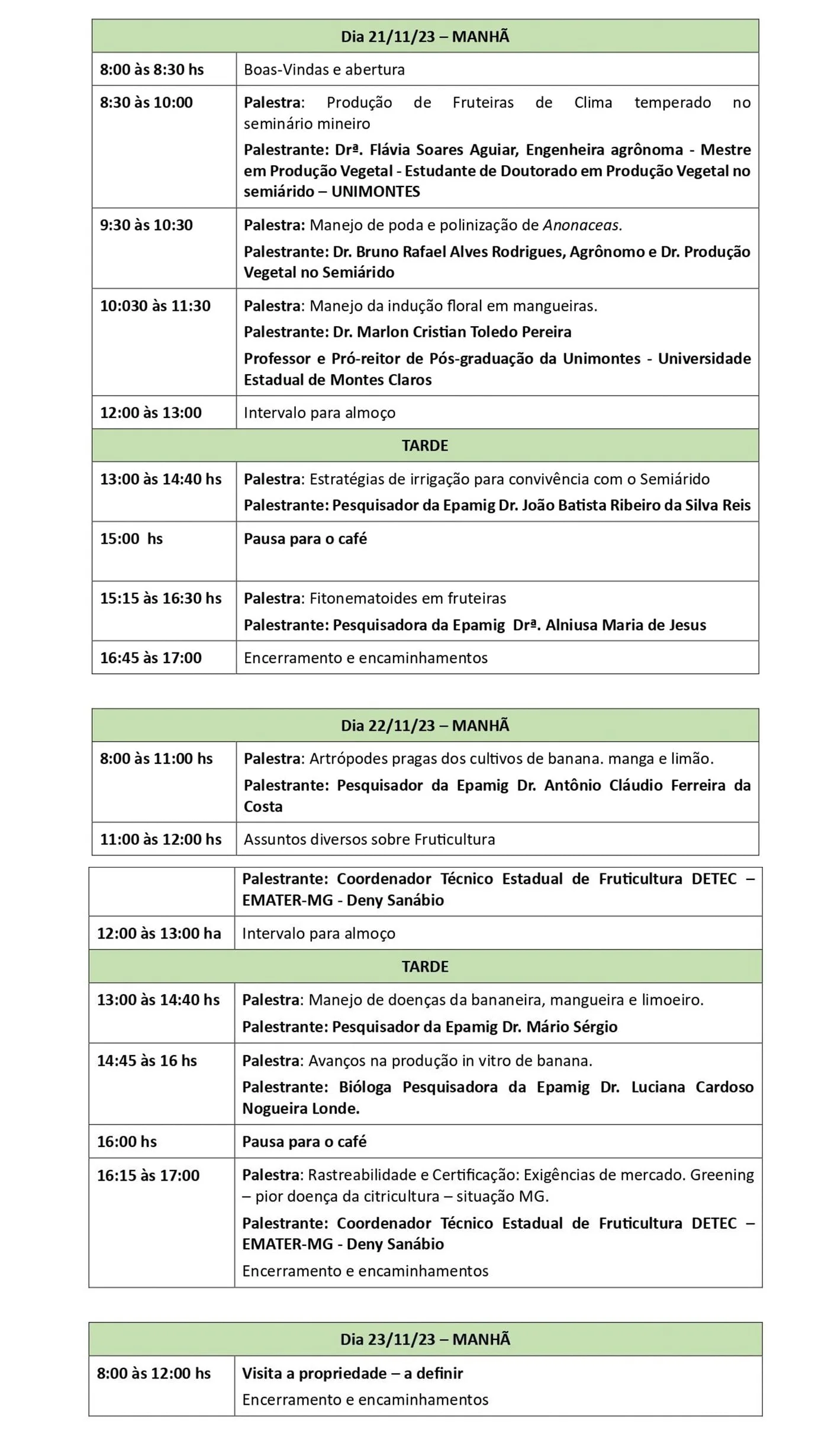 No total, nove palestras serão ministradas por pesquisadores da EPAMIG, técnicos da Emater-MG e profissionais da Universidade Estadual de Montes Claros (Unimontes). Dentre os temas tratados estarão a produção de fruteiras de clima temperado no semiárido mineiro, rastreabilidade e certificação, irrigação, produção in vitro, fitonematoides, Greening, além de outras pragas e doenças que atacam a fruticultura. No último dia do evento, os participantes visitarão duas propriedades rurais selecionadas pela Emater-MG, para conferirem, na prática, a aplicação de algumas tecnologias em cultivos de banana, limão e manga.