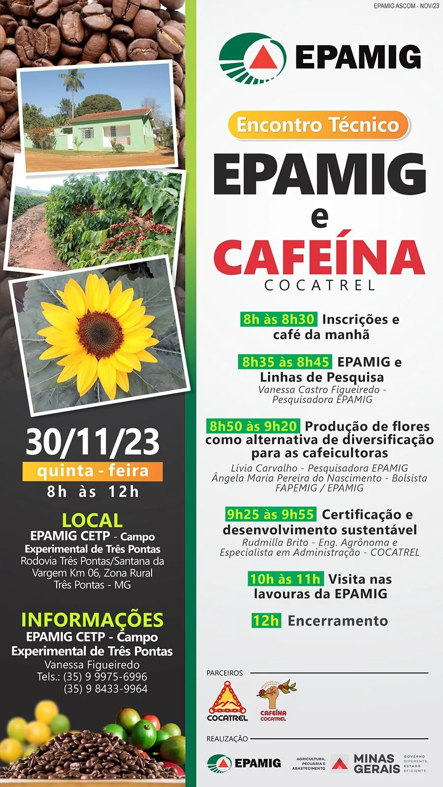 Após a fala de abertura, ministrada por Vanessa, na qual ela apresentará a EPAMIG e seus trabalhos em cafeicultura, ocorrerão as palestras “Produção de flores como alternativa de diversificação para as cafeicultoras”, realizada pela pesquisadora da EPAMIG, Lívia Carvalho, e, em seguida, “Certificação e desenvolvimento sustentável”, conduzida pela engenheira agrônoma da Cocatrel, Rudmila Brito.