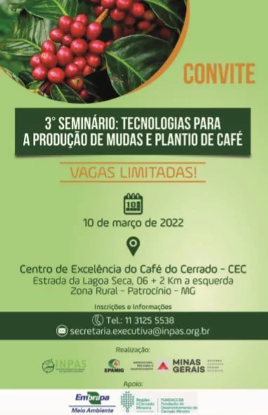 (Belo Horizonte – 4/3/2022) A Empresa de Pesquisa Agropecuária de Minas Gerais (EPAMIG) e a Associação Brasileira de Insumos para Agricultura Sustentável (Inpas) são parceiras na realização do Seminário Tecnologias para a produção de mudas e plantio de café. O evento que será realizado, no próximo dia 10 de março (quinta-feira), no Centro de Excelência do Café (CEC), em Patrocínio, tem apoio da Embrapa Meio Ambiente, da Federação dos Cafeicultores e da Fundação de Desenvolvimento do Cerrado Mineiro (Fundaccer).