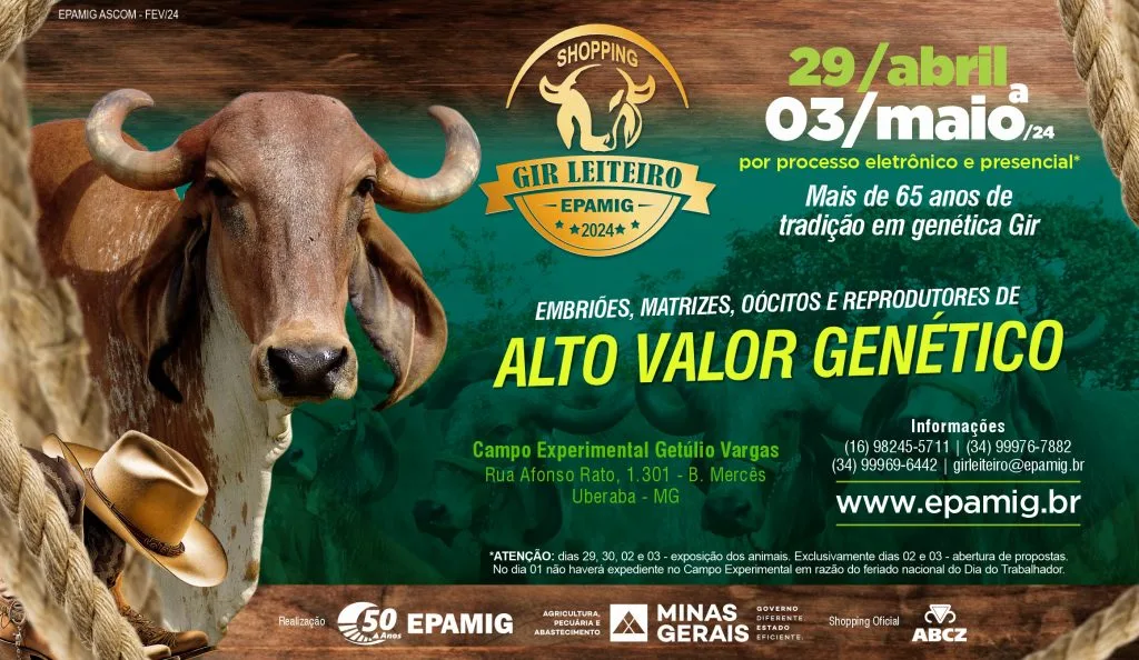 O Shopping Gir Leiteiro será realizado entre os dias 29 de abril e 3 de maio, de 8h às 16h, com visitações presenciais no Campo Experimental Getúlio Vargas da EPAMIG (Rua Afonso Rato, 1301, Bairro Mercês, Uberaba). O agendamento prévio deve ser feito com Rayanne Castanheira (34) 9 8441-7552 – ou Flávio Xavier (34) 99969-6442.