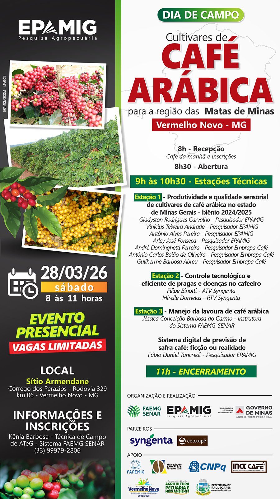 (Belo Horizonte – 24/3/2026) A Empresa de Pesquisa Agropecuária de Minas Gerais (EPAMIG), em parceria com o Sistema Faemg/ Senar, realiza no próximo sábado, 28 de março, em Vermelho Novo, o dia de campo “Cultivares de Café Arábica para a região das Matas de Minas”.