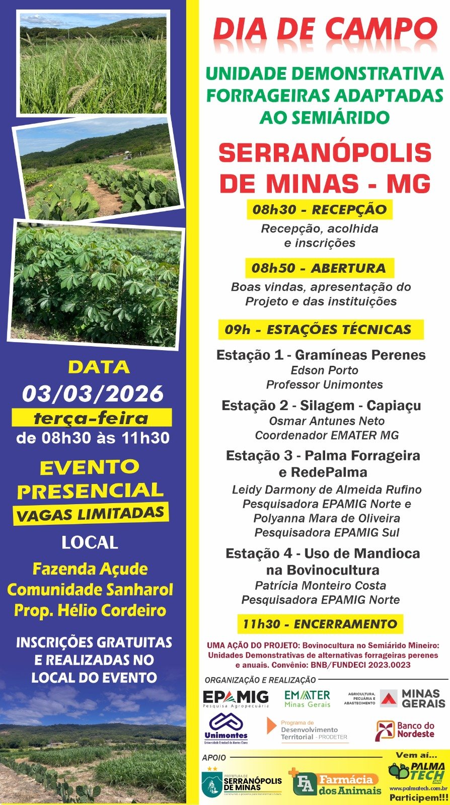 (Nova Porteirinha – 25/2/2026) A Empresa de Pesquisa Agropecuária de Minas Gerais (EPAMIG) promove na próxima terça-feira, 3 de março, em Serranópolis de Minas, o dia de campo “Forrageiras Adaptadas ao Semiárido”. O evento acontece na Fazenda Açude/ Comunidade de Sanharol, a partir das 8h30.