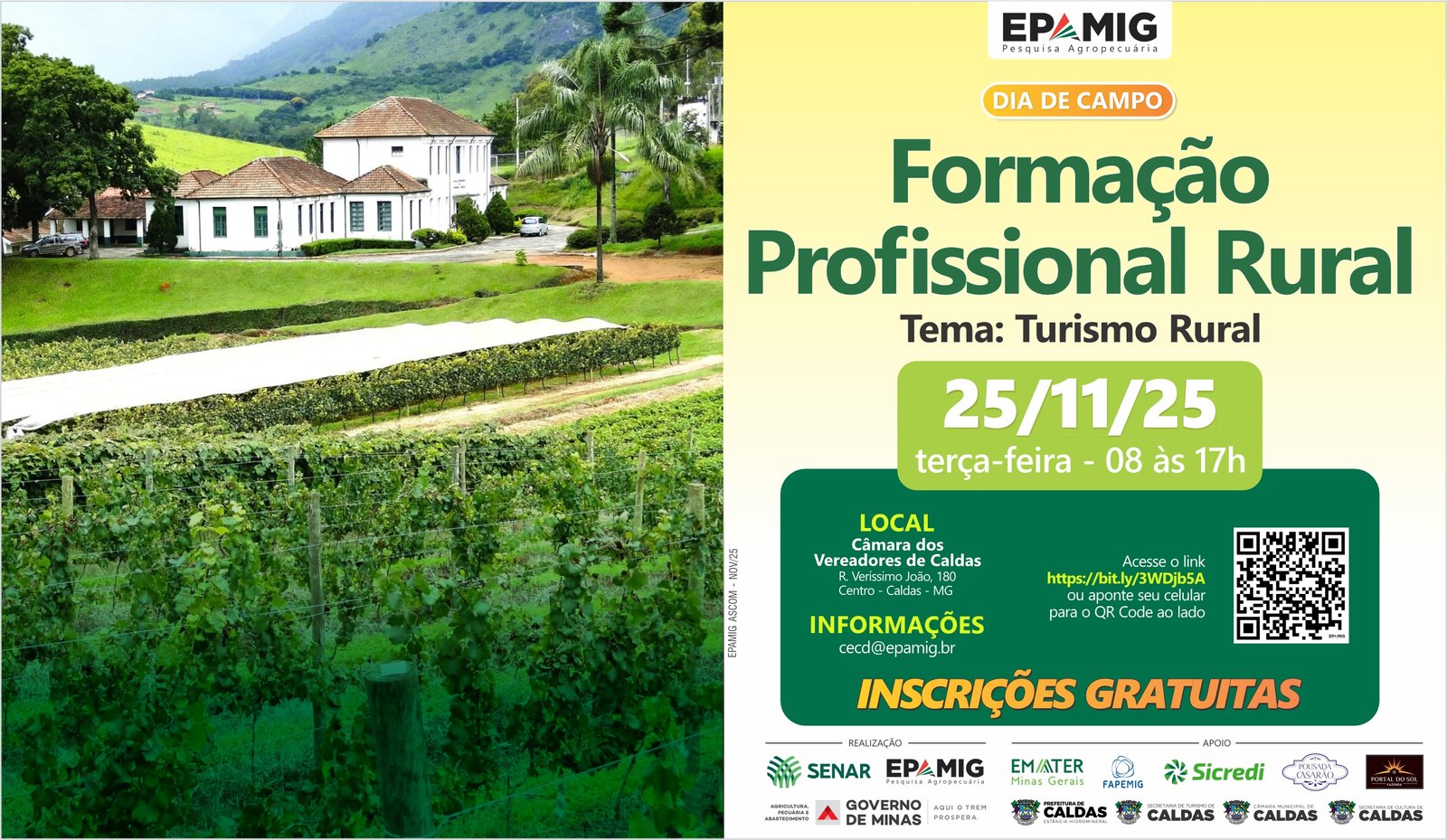 (Caldas – 17/11/2025) A Empresa de Pesquisa Agropecuária de Minas Gerais (EPAMIG) realiza no próximo dia 25 de novembro, em Caldas, Sul de Minas, o Dia de Campo “Formação Profissional Rural: Turismo Rural”. O evento gratuito acontece a partir das 8h, na Câmara dos Vereadores de Caldas.