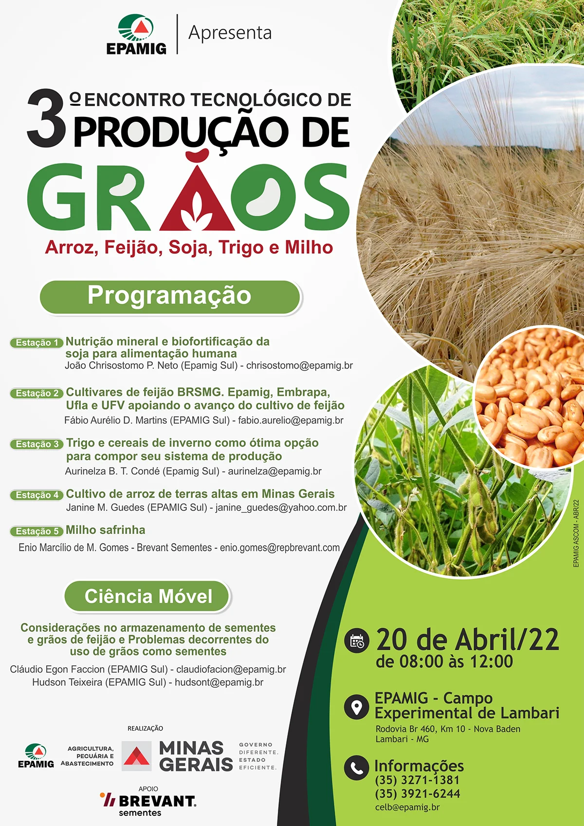 (Lambari – 5/4/2022) A Empresa de Pesquisa Agropecuária de Minas Gerais (EPAMIG) vai realizar o 3º Encontro Tecnológico de Produção de Grãos. O evento, presencial e gratuito, ocorrerá no dia 20 de abril, de 8h às 12h, no Campo Experimental da EPAMIG de Lambari (MG). As inscrições serão realizadas no dia e no local do evento.