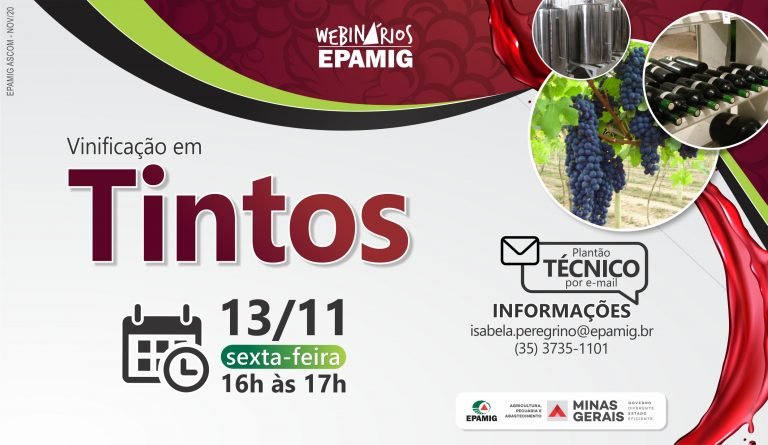 (Belo Horizonte, 11/11/2020) A Empresa de Pesquisa Agropecuária de Minas Gerais (EPAMIG) realiza na próxima sexta-feira, 13 de novembro, webinário sobre vitivinicultura. O evento, que