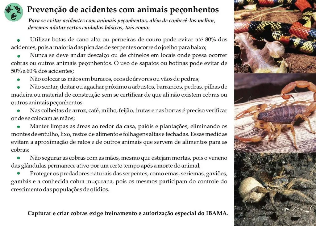 A especialista destacou ainda cuidados preventivos que devem ser tomados para evitar o contato com animais peçonhentos, como utilizar Equipamentos de proteção individual (EPIs), evitar entulhos e o hábito de usar perneiras durante caminhadas pela vegetação da fazenda.