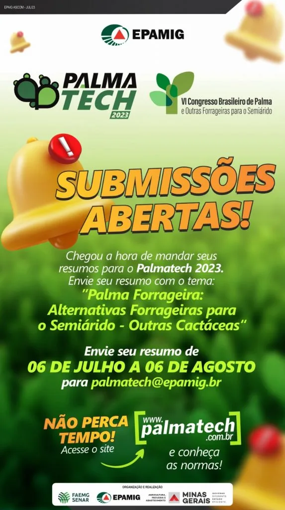 (Nova Porteirinha – 18/7/2023) Os interessados em inscrever resumos técnicos científicos para o “6º Congresso Brasileiro de Palma e Outras Forrageiras para o Semiárido”, que integra a programação do Palmatech 2023, têm até o próximo dia 6 de agosto para submeterem os trabalhos.