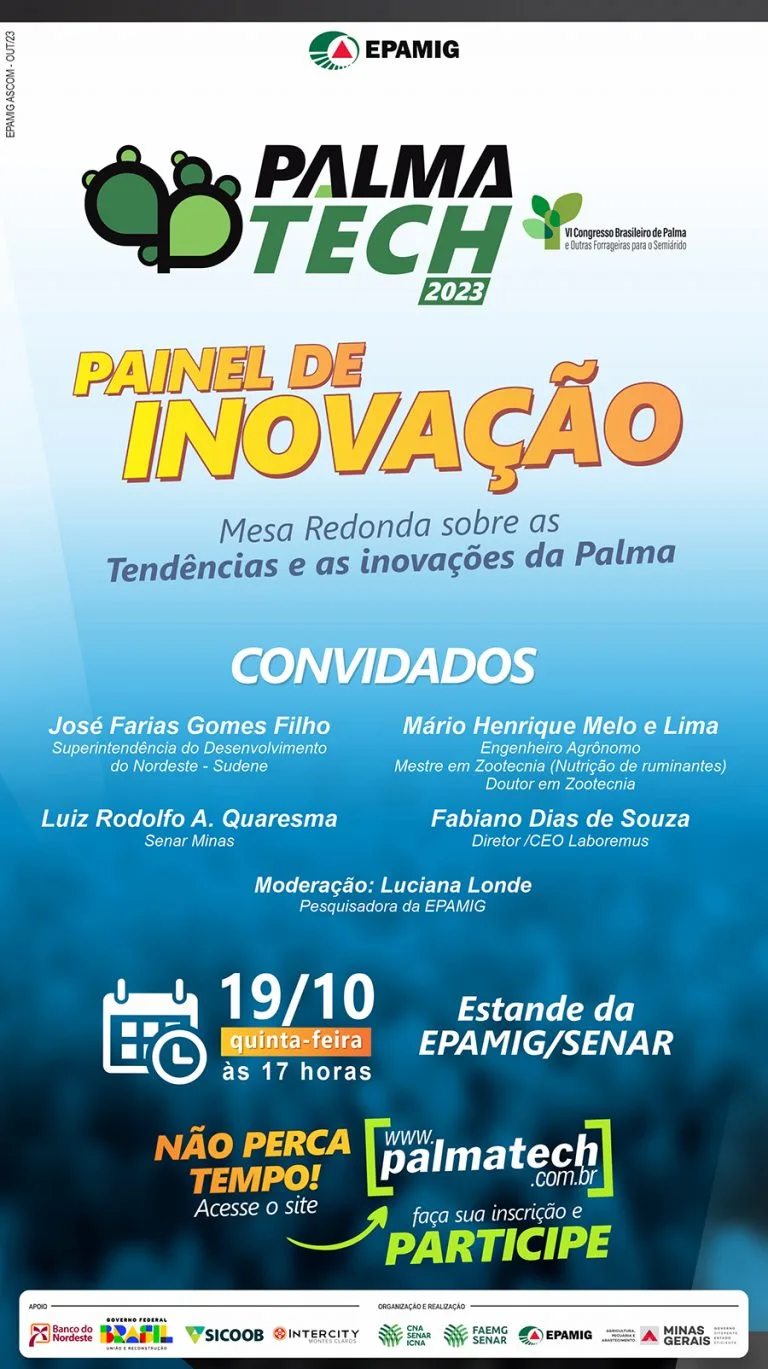 O Palmatech chega em 2023 à terceira edição. O evento, organizado pela Empresa de Pesquisa Agropecuária de Minas Gerais (EPAMIG), em parceria com o Sistema Faemg/Senar, tem como foco a cultura da palma forrageira e os diversos usos da planta na região do semiárido, com ênfase na utilização para a alimentação do rebanho em períodos de estiagem.