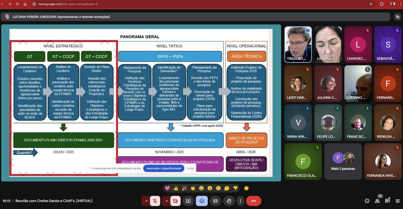(Belo Horizonte, 12.09.2025) A EPAMIG deu mais um passo na elaboração do planejamento da Empresa para os próximos cinco anos. O documento Plano Diretor tem previsão de ser lançado neste mês de setembro, contendo os novos objetivos estratégicos da EPAMIG e as estratégias de longo prazo, construídos a partir de estudos de cenários recentemente levantados, demandas e tendências do setor agropecuário e políticas públicas mineiras, nacionais e globais, assim como a revisão dos referenciais estratégicos da Empresa.