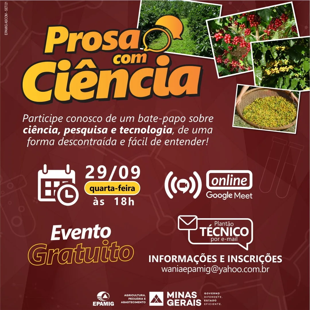O Prosa com Ciência tem sido realizado mensalmente, sempre em ambiente virtual. A proposta é discutir, de forma descontraída e de fácil compreensão, ciência, pesquisa e tecnologia na agropecuária. Mais informações podem ser solicitadas pelo e-mail waniaepamig@yahoo.com.br.