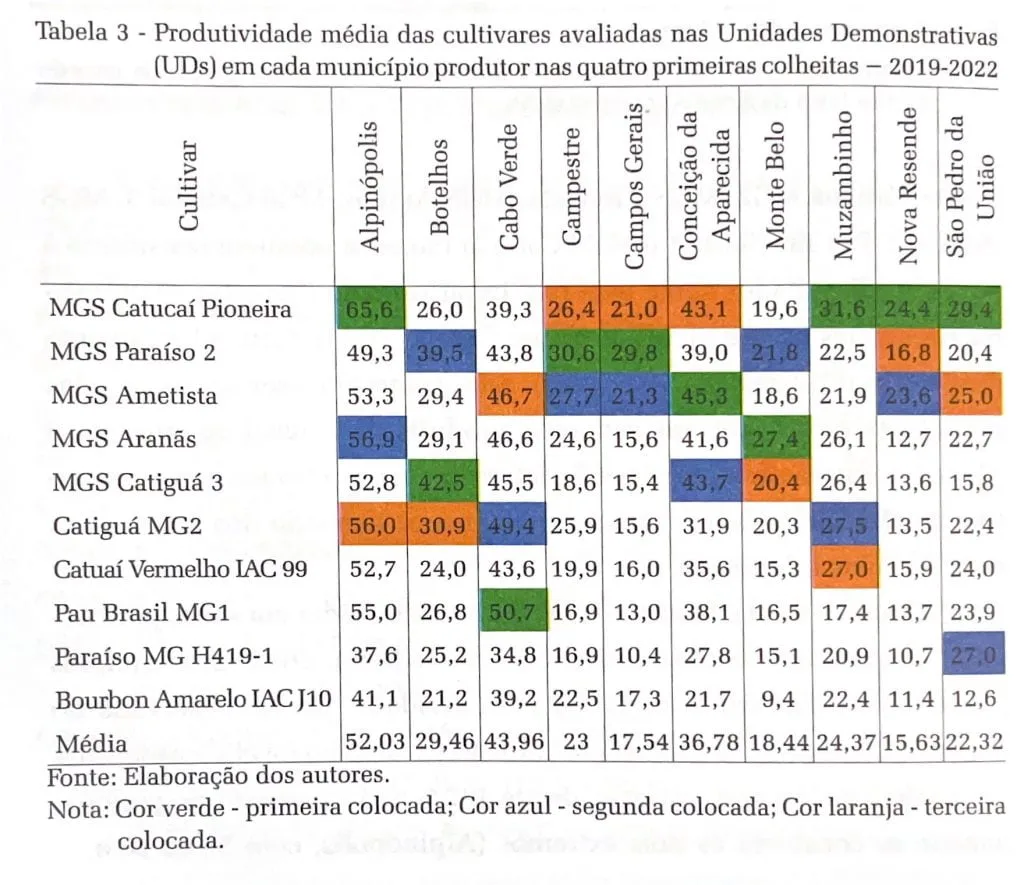 “No Sul de Minas, as cultivares MGS Catucaí Pioneira (entre as três melhores em sete dos dez municípios avaliados), MGS Ametista (entre as três melhores em seis dos dez municípios avaliados) e MGS Paraíso 2 (entre as três melhores em cinco dos dez municípios avaliados) foram as que mais se destacaram em produtividade, (confira a tabela). Na análise sensorial, a MGS Paraíso 2 foi a que obteve maiores pontuações pela estabilidade de comportamento”, informou.