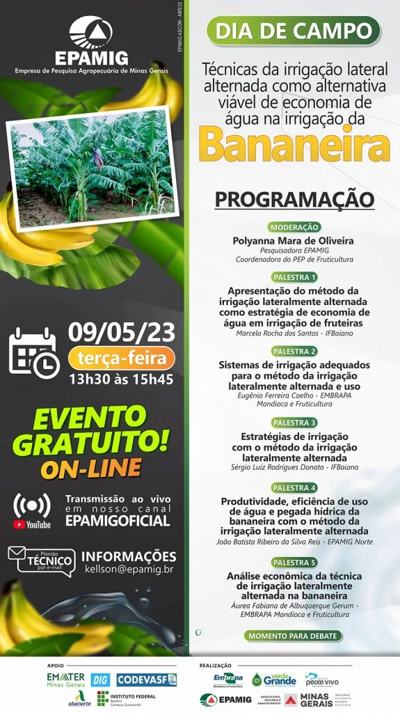 (Belo Horizonte – 8/5/2023) A técnica de irrigação lateral alternada tem se apresentado cada vez mais como uma opção viável e econômica para fruticultores mineiros, sobretudo em regiões semiáridas no Norte do estado. Com o objetivo de ampliar a difusão e aplicação do método para culturas como a da banana, a Empresa de Pesquisa Agropecuária de Minas Gerais (EPAMIG) promove, na tarde desta terça-feira (9/5), o dia de campo virtual “Técnica da irrigação lateral alternada como alternativa viável de economia de água na irrigação da bananeira”, com cinco palestras que serão transmitidas ao vivo pelo canal oficial da EPAMIG no YouTube, a partir de 13h30.